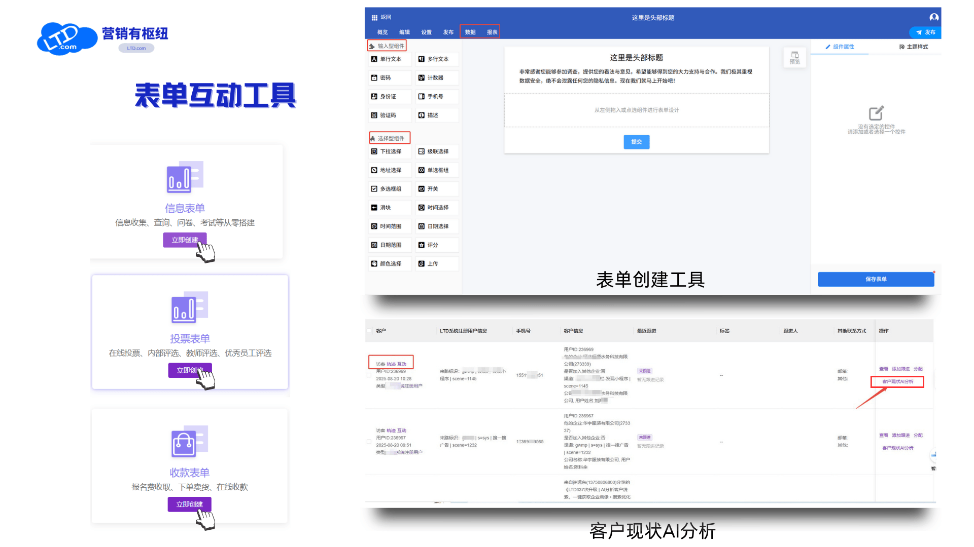 潜客阶段用专业价值破冰:相比直接推送产品介绍,行业诊断工具、能力测评等互动内容更易建立连接。LTD 营销枢纽的表单工具支持拖曳式创建可视化测评表单,涵盖单行文本、手机号、下拉选择等数十种字段类型,客户通过表单留资系统进行客户现状AI分析并同步至推送给销售团队。