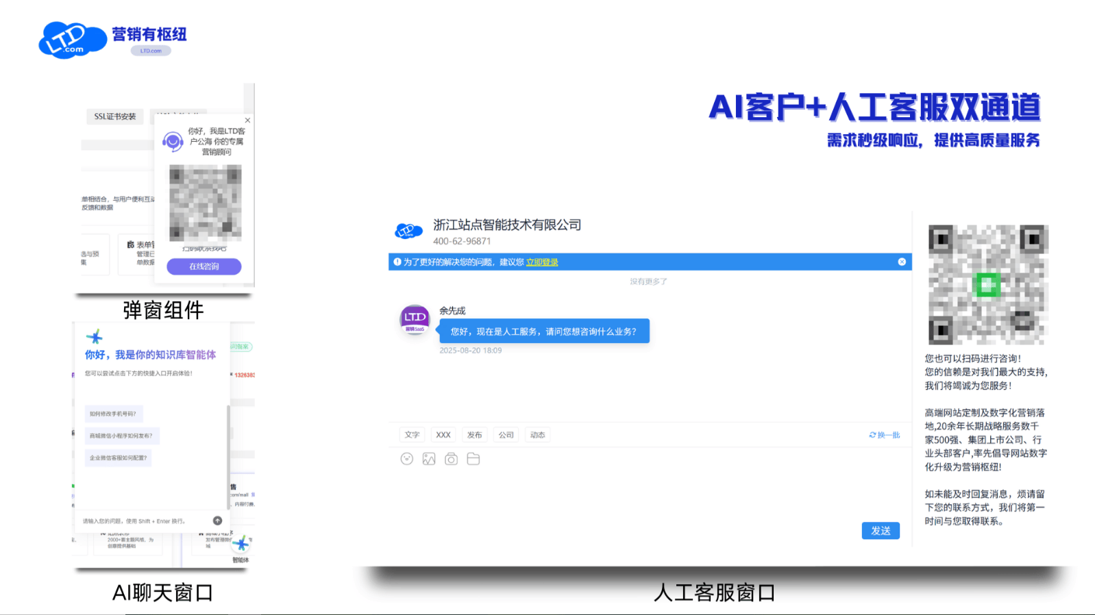 服务是最好的私域内容,B 端客户对问题解决效率的敏感度远超营销话术。官微中心整合表单咨询、电话咨询、工单提交等互动入口,将服务嵌入私域全场景:通过灵活配置的表单,客户能在官网、文章详情页等场景提交咨询需求,表单字段可按需自定义,涵盖业务诉求、联系方式等核心信息;页面中设置的电话组件支持一键拨号、微信组件可直接扫码加好友,相关诉求实时分配至对应团队,响应进度通过系统实时同步。官网内置的AI 智能咨询窗口,可自动推送行业白皮书、操作指南等硬核资料,即时解答基础问题。