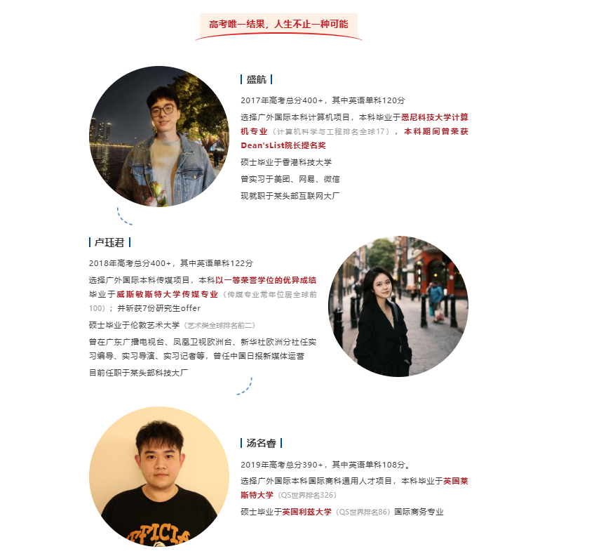 这样的逆袭并非个例,在广外国际学院的学子中,类似的故事不断上演。有同学高考总分400多分,通过学院计算机方向项目,最拿到了香港科技大学硕士学位,如今已入职国内头部互联网大厂;还有高考总分390多分的同学,通过国际商科通用人才项目,成功升入QS排名86位的英国利兹大学;一位体育单招考生也通过学院体育管理项目,本科与硕士阶段均就读于体育科学全英排名第2 的英国朴次茅斯大学,如今还在该校攻读运动心理学博士学位......