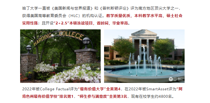 哈丁大学的办学实力与认可度,是其成为广外合作院校的重要原因。该校不仅被《美国新闻与世界报道》《普林斯顿评论》评为美国南方地区顶尖大学,还获得美国高等教育委员会机构认证,学历可通过中国教育部留学服务中心认证,为学生学历回国认可度提供坚实保障。在性价比方面,哈丁大学表现尤为突出:2022年被College Factual评为“最有价值大学”全美第4,同年被SmartAsset评为“阿肯色州最有价值学校” 第1名,“师生参与满意度” 更是位列全美第3名,教学科研能力在美国处于上等水平。