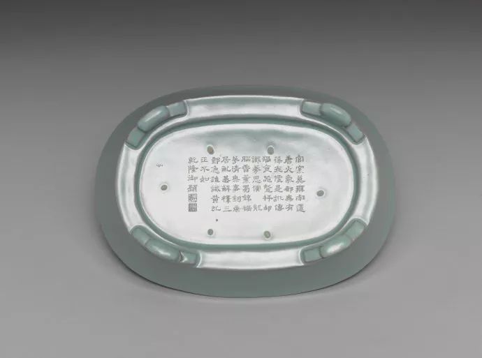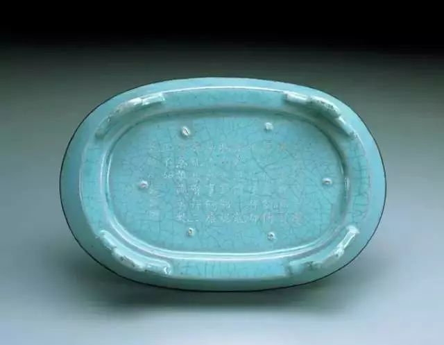 品名:北宋汝窑青瓷水仙盆尺寸:高5.6cm 深2.5cm 口纵15.2cm 口横23cm 底纵13cm 底横19.6cm典藏号:故瓷013977原收藏地:重华宫底部支钉:6枚传记:椭圆形盆、突出一圈侈口、深壁、平底、足底间突出一圈窄边稜、四足、足呈云头形。1936年曾参加伦敦中国艺术国际展览会,编号Porcelain No.25。全器满釉不露胎,仅在器底留下六个细小支钉痕。器底刻有乾隆御题一首。明代鉴赏家曹昭在《格古要论》中提到,汝窑瓷器「有蟹爪纹者真,无纹者尤好」。这件水仙盆釉色匀润,通体无文,是传世所见唯一一件没有开片的汝窑瓷器。御制诗:官窑莫辨宋还唐,火气都无有葆光,便是讹传猧食器,蹴秤却识豢恩偿,龙脑香薰蜀锦裾,华清无事饲康居,乱碁解释三郎急,谁识黄虬正不如。台北故宫馆藏21件汝窑完整介绍之十四汝窑青瓷圆洗▼