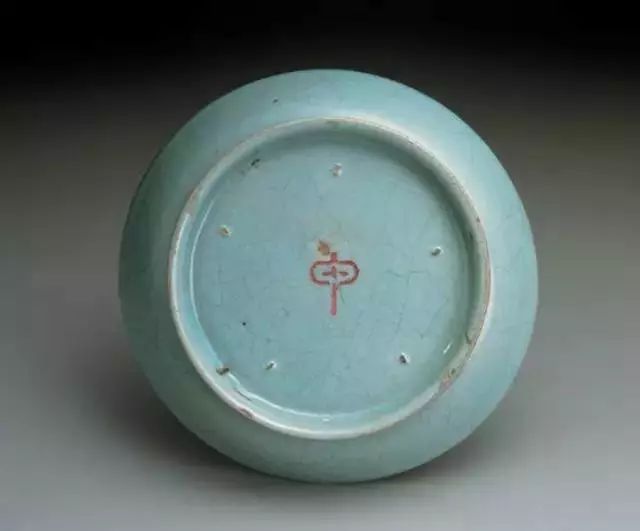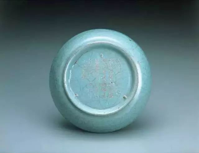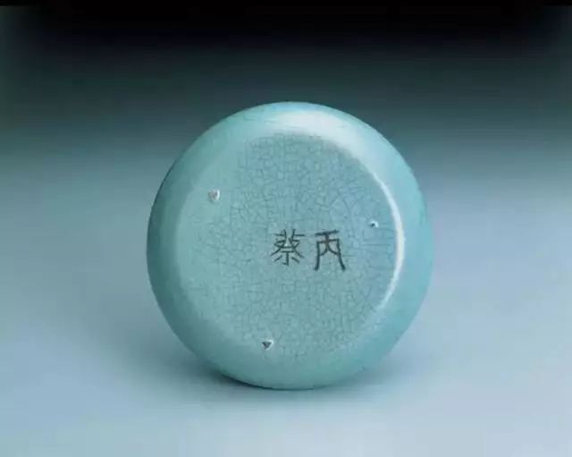 品名:北宋汝窑青瓷圆洗尺寸:高3.8cm 深2.4cm 口径15.8cm 足径15.5-15.7cm典藏号:故瓷017850原收藏地:古董房底部支钉:5枚传记:侈圆口、浅壁、壁呈弧形、平底、圈足外撇。底部有五支钉痕,并刻有乾隆壬辰年(1772)新春御题一首。除此之外,足心还刻有一篆书「甲」字。乾隆在诗中有「底心镌甲字」,指的应该就是这个「甲」字刻痕。此件作品在1936年曾参加伦敦中国艺术国际展览会。台北故宫馆藏21件汝窑完整介绍之十二汝窑青瓷“甲”字盘▼