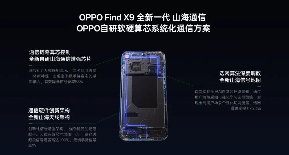 根据介绍,OPPO Find X9系列带来了超级山海射频天线,实现行业直板机最长低频天线,天线有效尺寸增加一倍, 高穿透频段信号增强高达 100%。