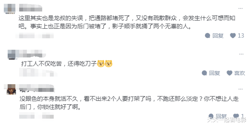 对此,理智型网友分析:这其实是老黄(成龙)的失误,明知影子极端危险,却没提前疏散群众。也有人调侃:“打工人不易,不仅吃苦,还要吃刀子。”还有人吐槽:“这服务员也太没眼力见了,看到气氛不对还不赶紧跑!”