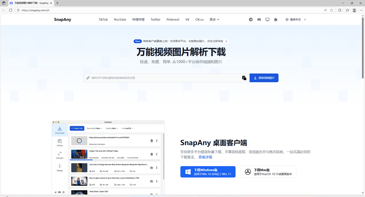 三、snapAny这个网站可以无水印下载各大主流平台的原视频以及封面。不管是国内的抖音、哔哩哔哩、西瓜视频,还是国外的 TikTok、Facebook、YouTube 等平台,只需要复制视频链接,就能直接读取原视频、高清封面以及音频,点击下载按钮即可进行无水印下载。重要的是无需登录,且无任何广告。