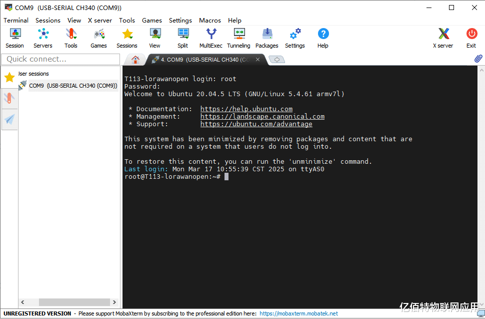 完成上一步后进入该界面(最开始无“T113-lorawanopen login:”字样,需要敲一下回车才可以显示),依次输入账号和密码,账号和密码均为“root”。