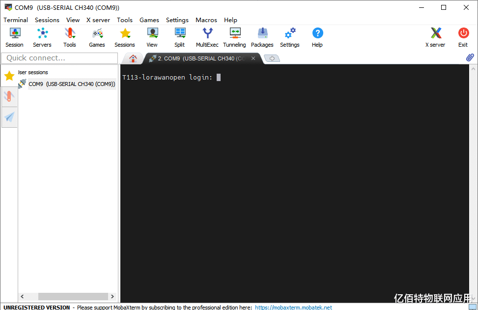 使用USB数据线连接设备调试口,打开配置工具-MobaXterm软件(官网可下载安装包,用户自行安装),点击左上角的“Session”。