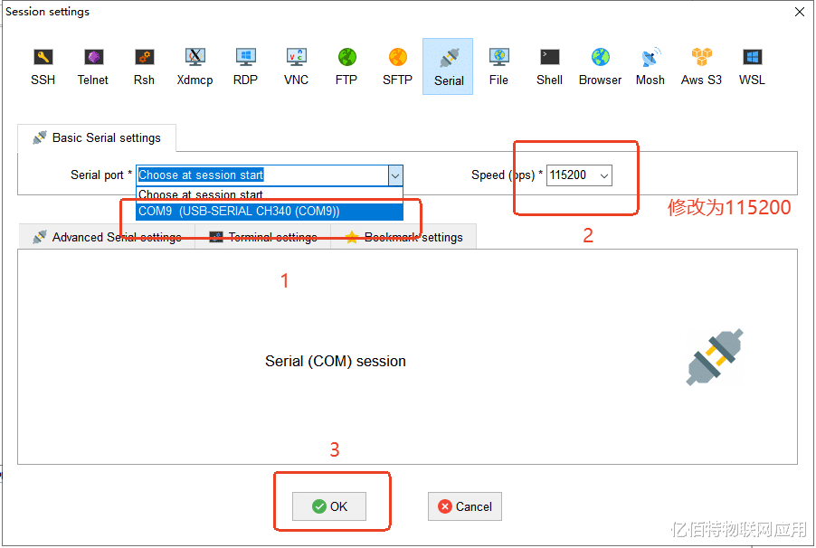 选择端口号,修改波特率为115200,设置完成后点击OK。