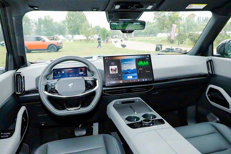 这台绿牌烈马在设计基本和燃油版保持一致,整体依旧是越野车常见的“盒子”造型,也有外挂式备胎,只不过车长增加到了5025mm,且车顶有激光雷达,更强调舒适性和智能化。除此之外,该车轮眉、保险杠凸出没那么夸张,并且前脸的字母标识改成了LED背光设计,更显电车主题。
