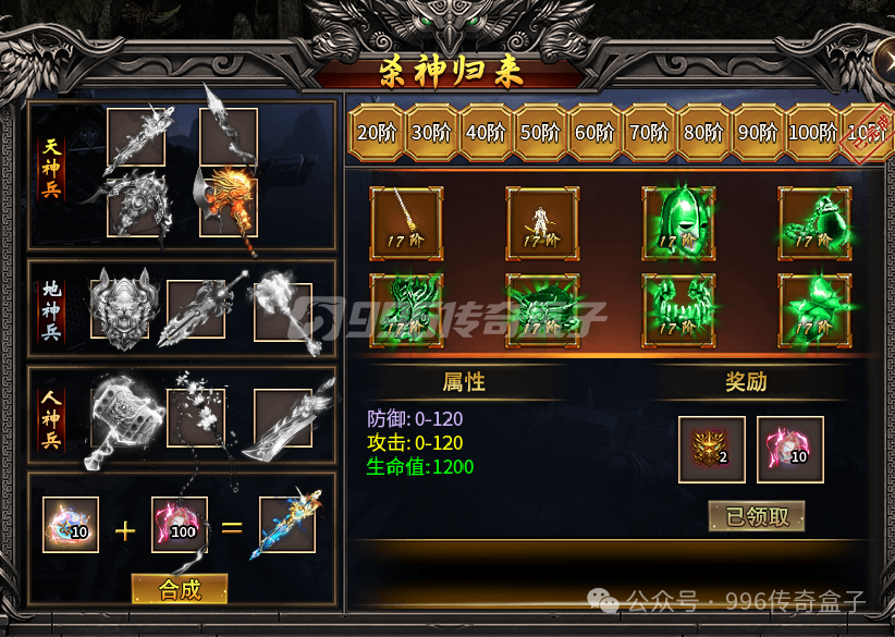 【杀神归来】:神兵合成的玩法,刷怪收集装备,可以获得属性和材料奖励,用这些材料可以合成神兵。神兵分为三个阶段,天神兵、地神兵和人神兵,各有不同的属性加成,合成后可以选取任意材料给神兵注灵升级,神兵升级可以获得更强劲的属性!