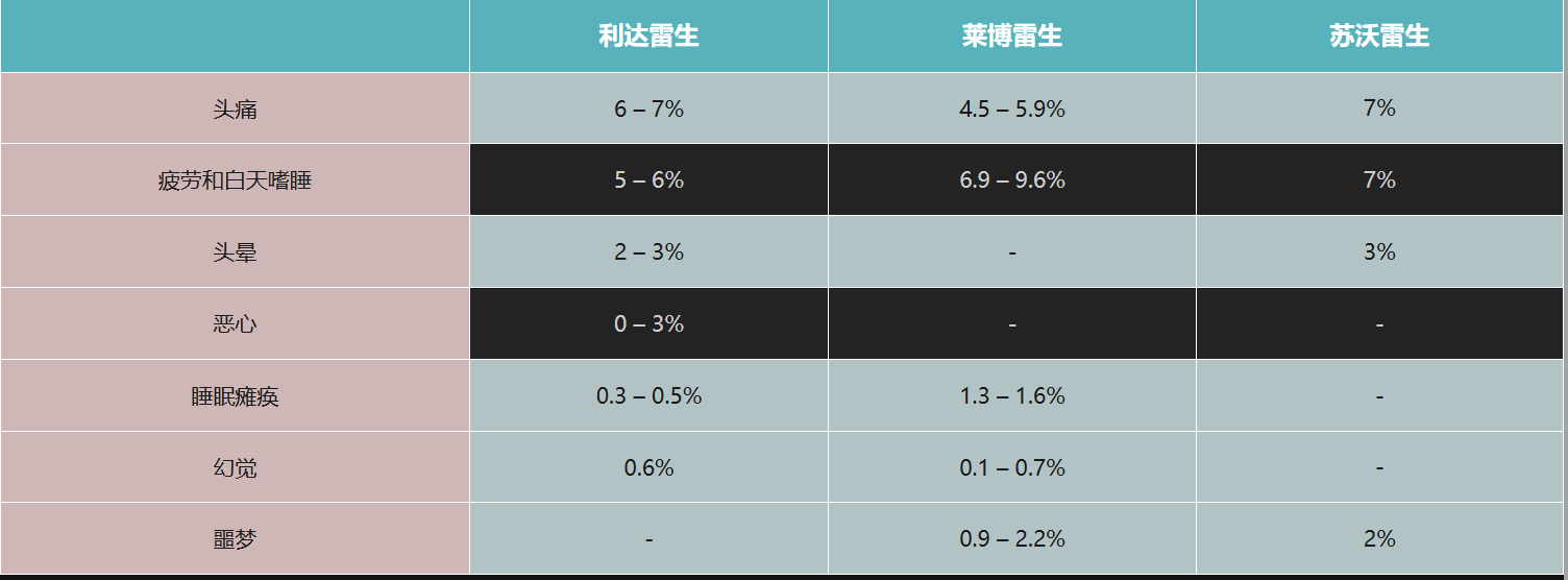 菜博雷生由于其半衰期较长,与更多的白天嗜睡、疲劳和嗜睡有关。头痛、头晕和恶心在利达雷生和苏沃雷生更常见,而睡眠麻痹、幻觉和黑梦在莱博雷生中很常见,