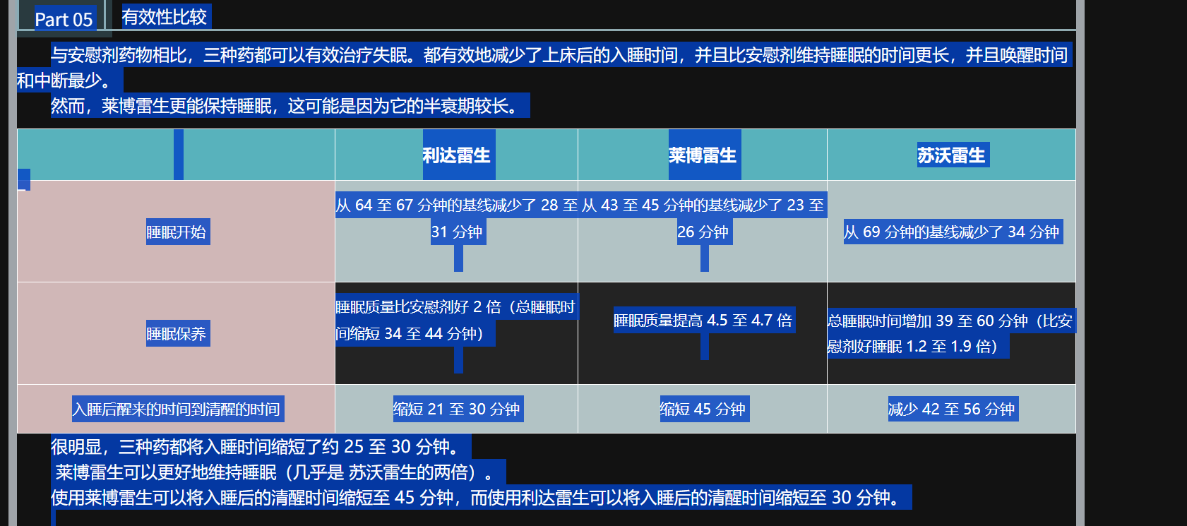 与安慰剂药物相比,三种药都可以有效治疗失眠。都有效地减少了上床后的入睡时间,并且比安慰剂维持睡眠的时间更长,并且唤醒时间和中断最少。然而,莱博雷生更能保持睡眠,
