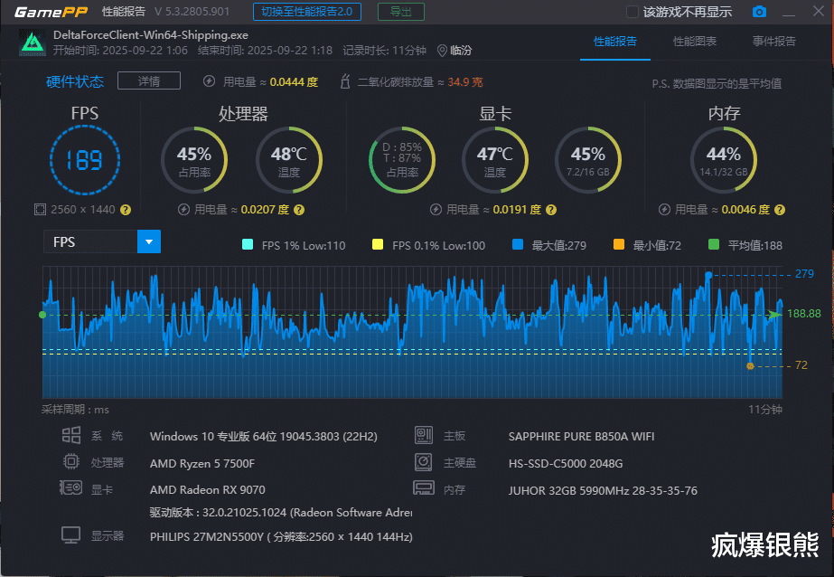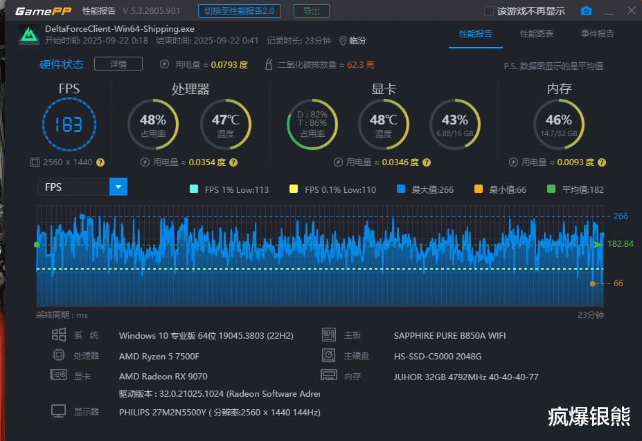 游戏方面,以最常玩的《三角洲行动》为例,2K最高画质,都是大战场同一张地图,都是攻方,角色一致。默频状态下平均帧率在183,最低帧66,最高帧266;开启EXPO后,超低时序带来的低延迟提升明显,其中平均帧提升至189,最低帧提升至72,最高帧279。