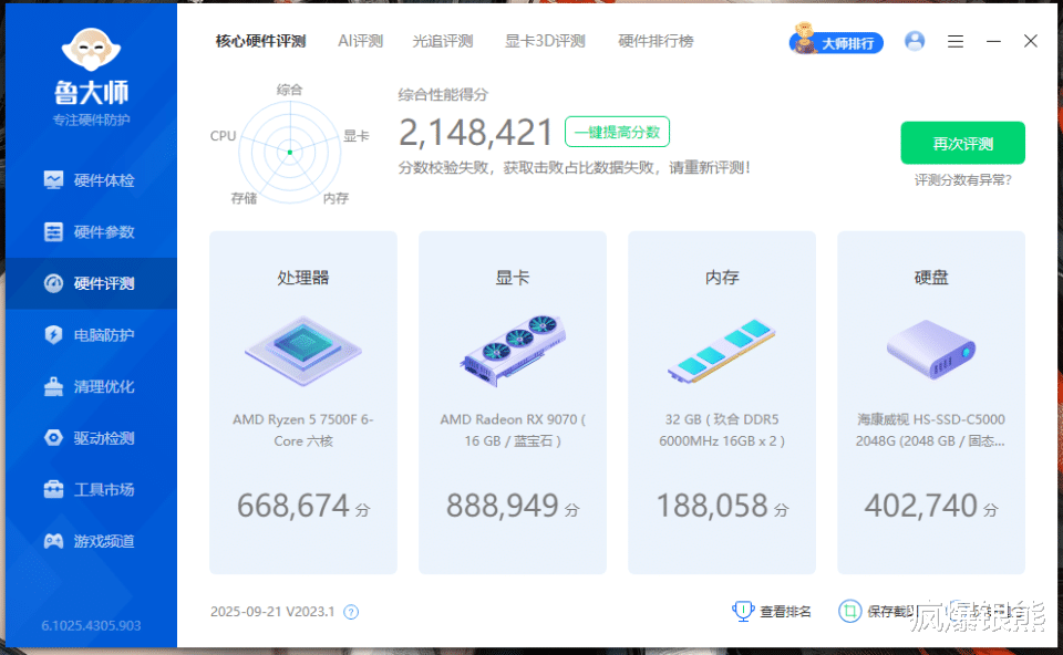 除了单独对内存的性能做了测试外,这里我也用鲁大师整机跑分对超频前和超频后的整机表现做了测试。不超频整机214.8万分,超频后219.4万分,其中除了内存提升3.3万分外,处理器和显卡在高频率内存加持下性能也有显著提升。
