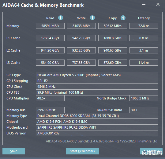 此时在6000MHz我们用AIDA64继续测试超频后的读写复制表现,结果如上图,其中读取58591MB/s,写入81033MB/s,复制59612 MB/s,此时的内存延迟低至72.8ns(延迟越低越好)。