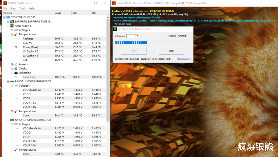 关于散热效果上,这里我也简单在处理器和显卡双烤状态下测试了下,室温25°C左右,内存最高温度不超35°C,比处理器、显卡和SSD的温度都低不少。
