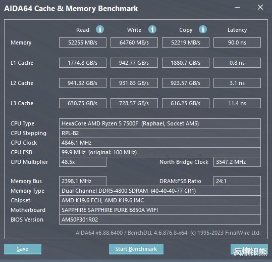在默认频率下,在AIDA64中简单测试了下读写复制速度,其中读取52255MB/s,写入64760 MB/s,复制52219MB/s,此时的内存延迟90.0ns。