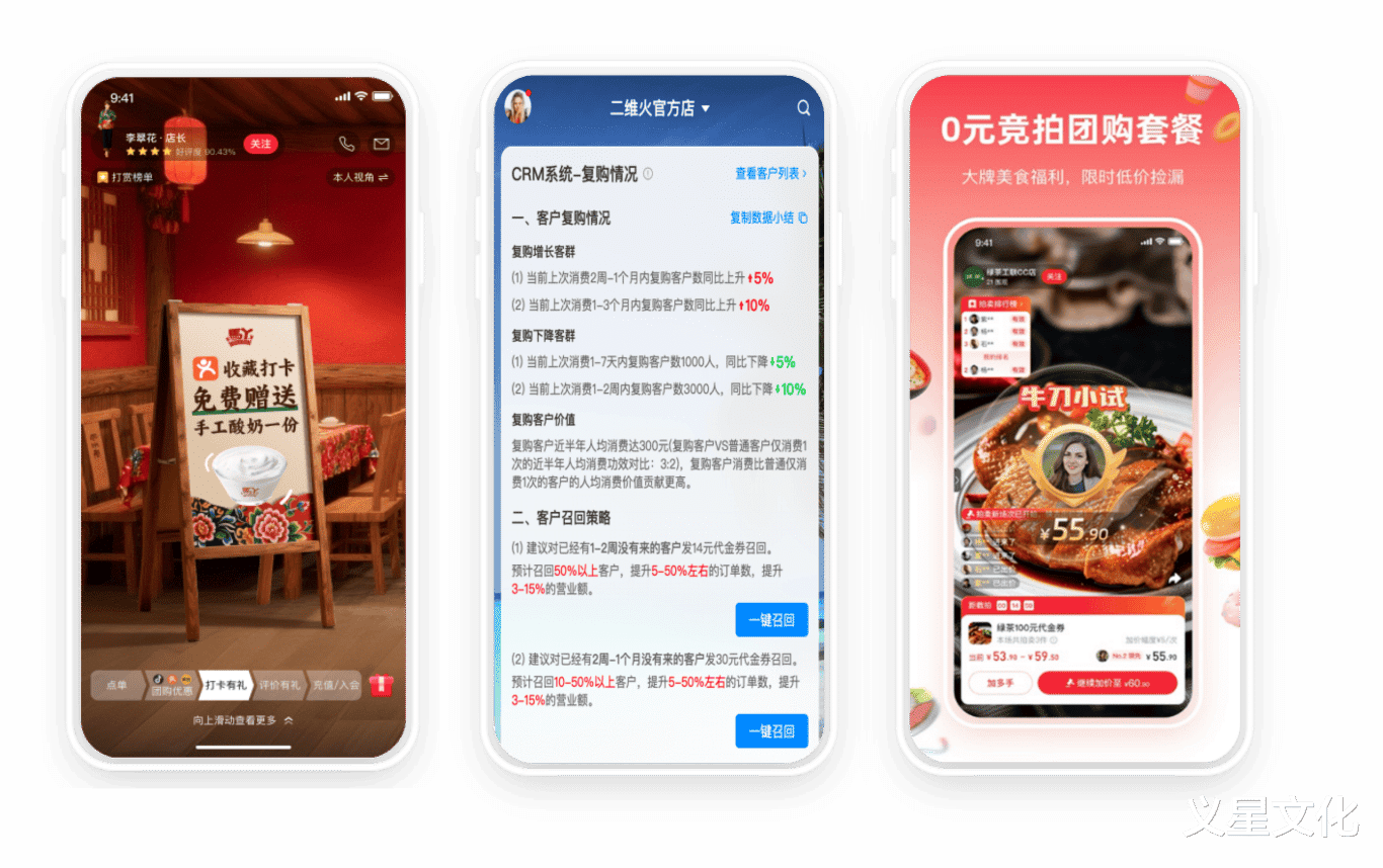 2、六大连招:包括消费后多平台种草、团购一键核销、老客召回、互动拍卖等,覆盖从引流到复购的全链路场景。