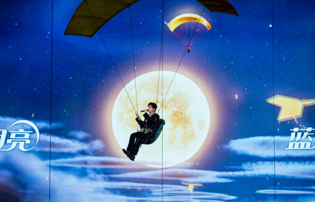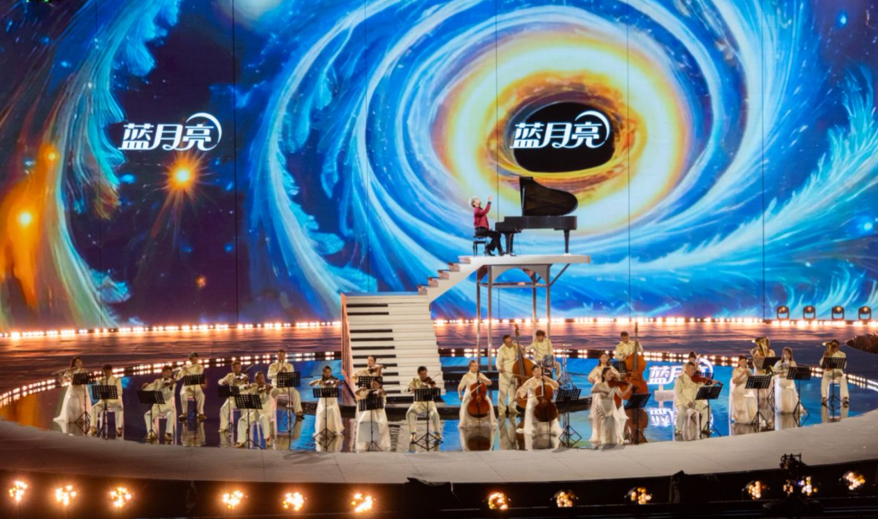 本次晚会最大的创新在于打破传统舞台表演模式,通过多维度技术手段重新定义“人—月—舞台”的三角关系。依托漳泽湖天然水域,制作团队打造360度环形水景舞台,结合水幕投影、AR、VR、XR等技术,实现“地月场景切换”,营造出极具沉浸感的神话意境。国际钢琴家马克西姆与国家级非遗“上党八音会”及长治交响乐团合作,演绎改编版《云宫迅音》,加上无人机秀与裸眼3D视觉,这种神话叙事与科技美学的结合,既是对文化根脉的致敬,亦是对年轻观众审美需求的精准回应。