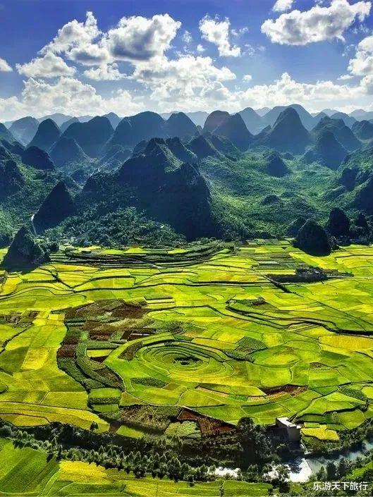 纳灰河蜿蜒流淌在万峰林的峰林之间,布依族村寨点缀其中,农田、村庄与峰林相互映衬,构成了如诗如画的田园风光。