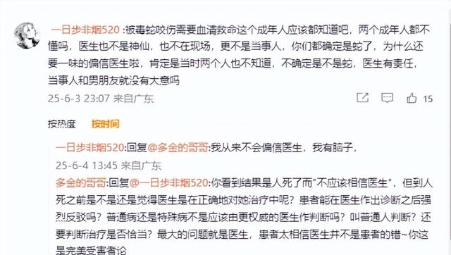 有网友认为,被毒蛇咬伤需要抗毒血清救命是常识,而且医生又不是神,又没在现场,既然男友都确定是蛇了,为什么还要一味听医生的?