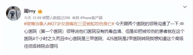 甜甜的家属认为甜甜的死和两家医院的不当救治有很大关系,尤其是三亚中心医院,伤者已经明确说了是蛇咬,医生却不相信,非要等血检结果。