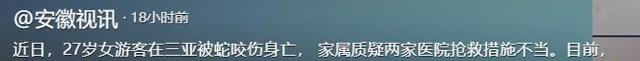 一27岁女游客甜甜和男友张鹏(化名)来三亚旅游,不料甜甜竟被突然窜出的毒蛇咬伤,随后甜甜被辗转两家医院救治,最终仍因抢救不及时离开了人世。