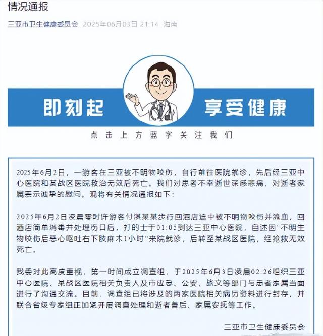 如今,三亚卫健委已专门成立调查组,针对此事展开调查,并联合应急、公安、文旅等部门与死者家属进行沟通,涉事两家医院的相关病例资料也已封存。