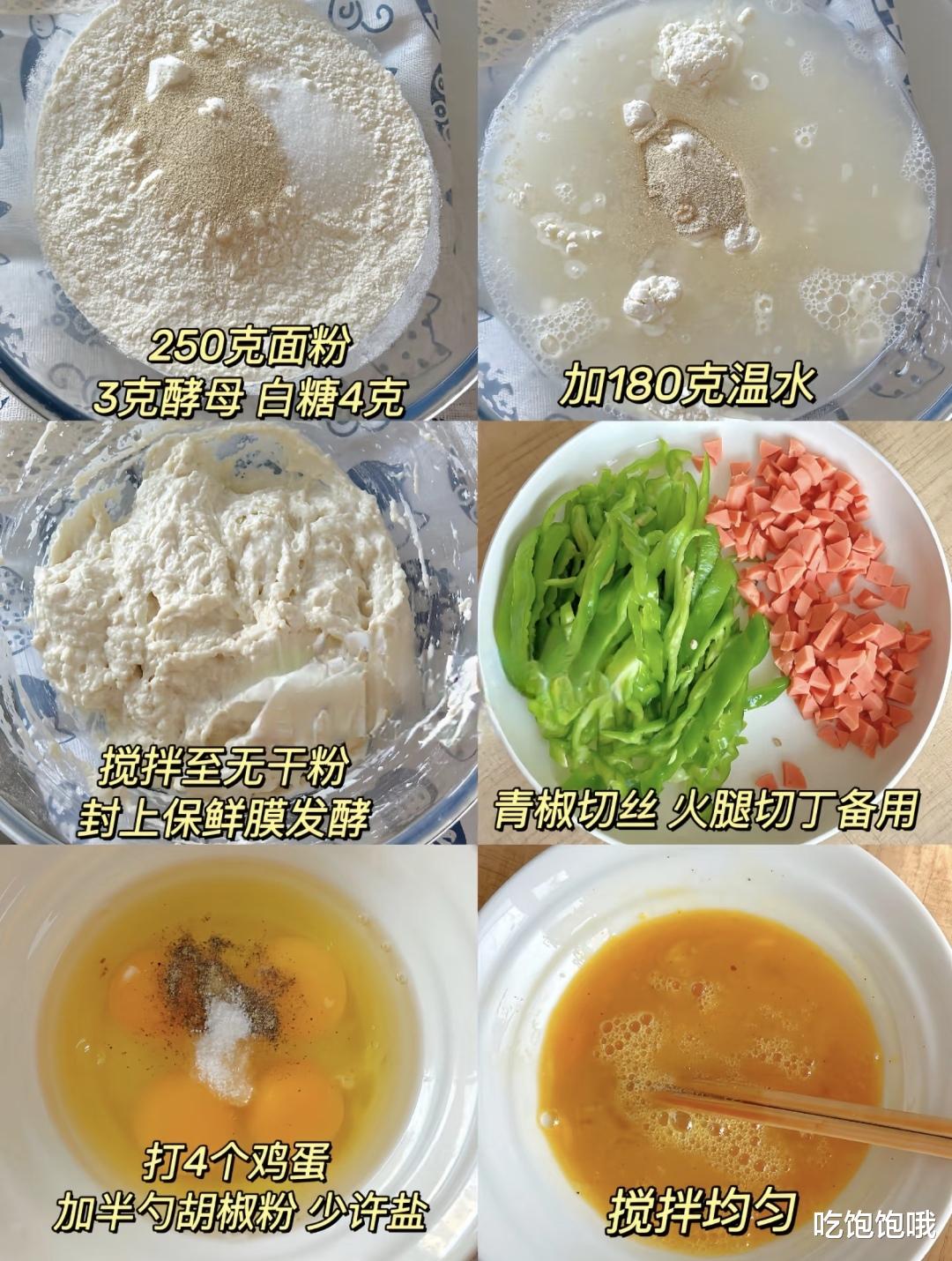 5️⃣锅中刷油,火热取适量面团铺平,尽量铺薄一点,放上青椒火腿,倒入适量蛋液,煎至两面金黄就好啦