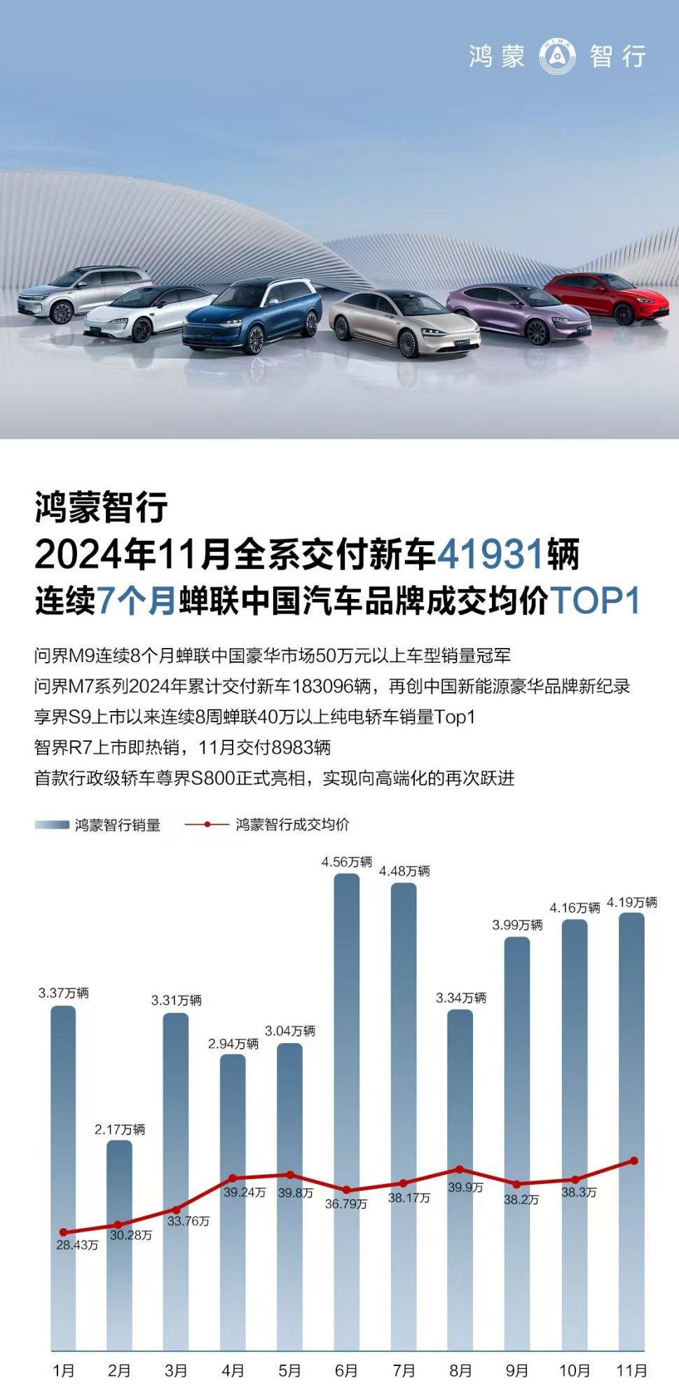 据统计,鸿蒙智行在2024年11月全系交付新车数量再创历史新高,这一成绩的取得,不仅是对鸿蒙智行产品品质的认可,更是对其市场策略的成功验证。连续7个月稳居中国汽车品牌成交均价TOP1的宝座,充分展现了鸿蒙智行在豪华车市场中的强大竞争力。