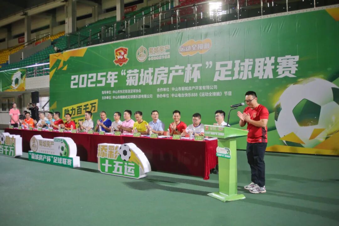 开幕式上,镇街领导、合作单位代表及参赛球队代表共同出席开幕式并参与比赛的开球仪式。中山市菊城房产开发有限公司代表表示,足球是凝聚力量的运动,是拼搏与协作的象征。这场以“助力百千万,添彩十五运”为主题的联赛,其精神内核正与中山当前高质量发展的奋进姿态高度契合。菊城房产公司作为镇属骨干企业,深耕房地产市场三十余载,先后打造了一批批精品项目。“我们深知,坚实的城市基底、优美的人居环境与蓬勃的社区活力,是‘百千万工程’最生动的注脚。因此,我们赞助并冠名本届联赛,正是希望以体育为媒,激发全民健身热情,为城乡注入更多活力与温度”。