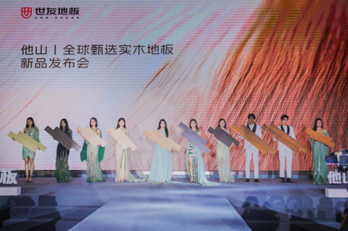发布会还通过宣传片和产品秀,为嘉宾带来了一场沉浸式的感官体验。模特手持“他山”系列地板样品依次登场,配合主持人的生动解说,充分展现了产品的艺术价值与工艺魅力。现场展示了15款产品,从浅米色的“暖玉云纱”到深棕色的“玉檀琥珀”,每一款地板都以其独特的色彩与纹理,将东方玉文化的温润与木质的天然纹理完美融合,为高端家居提供了多样化的美学选择。