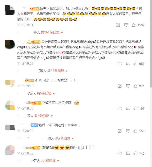 而从粉丝们的留言来看,大家基本上都是一种鼓励的状态,没有给EDG太多的压力。退一步讲,就算是EDG战队输了,相信各位也不会暴跳如雷。经过这么些年S赛的熏陶和洗礼,也看过了很多EDG战队的比赛,我想很多“淀粉”都看开了,EDG战队努力比赛就好,他们有的时候可能会犯病,但也总是能带来奇迹,冲就完事了。
