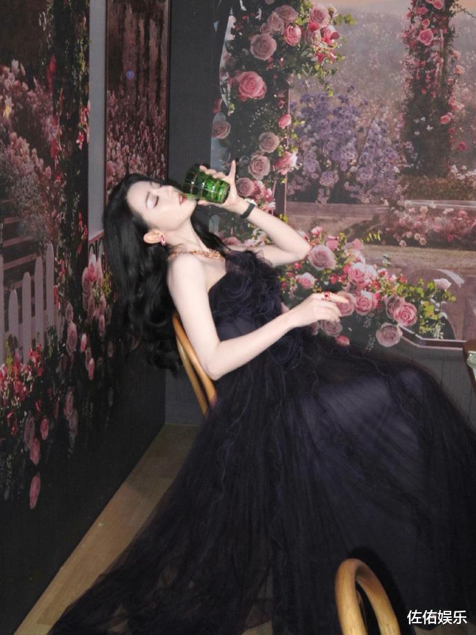 画面中的迪丽热巴穿着一袭黑色抹胸长裙,露出优美的肩颈线条,层叠的裙摆营造出丰富的层次感,整体造型华丽高贵,凸显出她的优雅气质。她斜倚在椅子上,手持绿色瓶子,姿态慵懒又不失优雅,繁花似锦的景象营造出一种梦幻般的氛围,仿佛将人带入一个世外桃源。