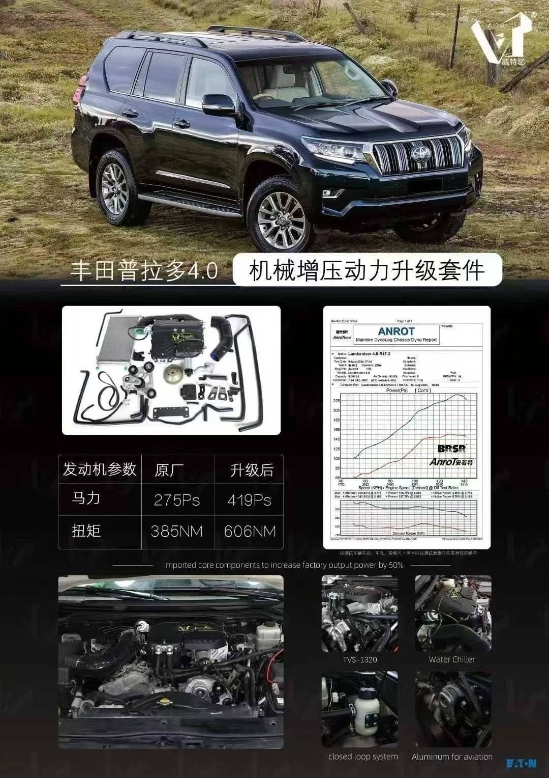 升级美国伊顿 TVS 机械增压后,普拉多4.0的动力数据实现了质的飞跃。原厂 275 马力提升至 419马力,扭矩从 381牛米 飙升至 606牛米,动力增幅高达 40% 。这种提升带来的驾驶体验变化是直观而震撼的。