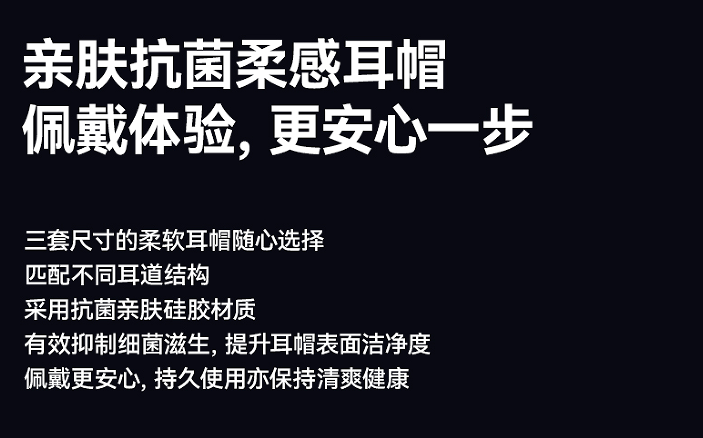 耳机还配备三种尺寸柔软耳帽,可适配不同耳道结构,耳帽表面经过抗菌处理,可有效抑制细菌滋生,佩戴时亲肤柔软、贴合稳固,大大减少细菌积聚的风险。无论是日常运动还是长时间聆听,都能让用户佩戴更安心,让耳朵时刻保持清爽健康。