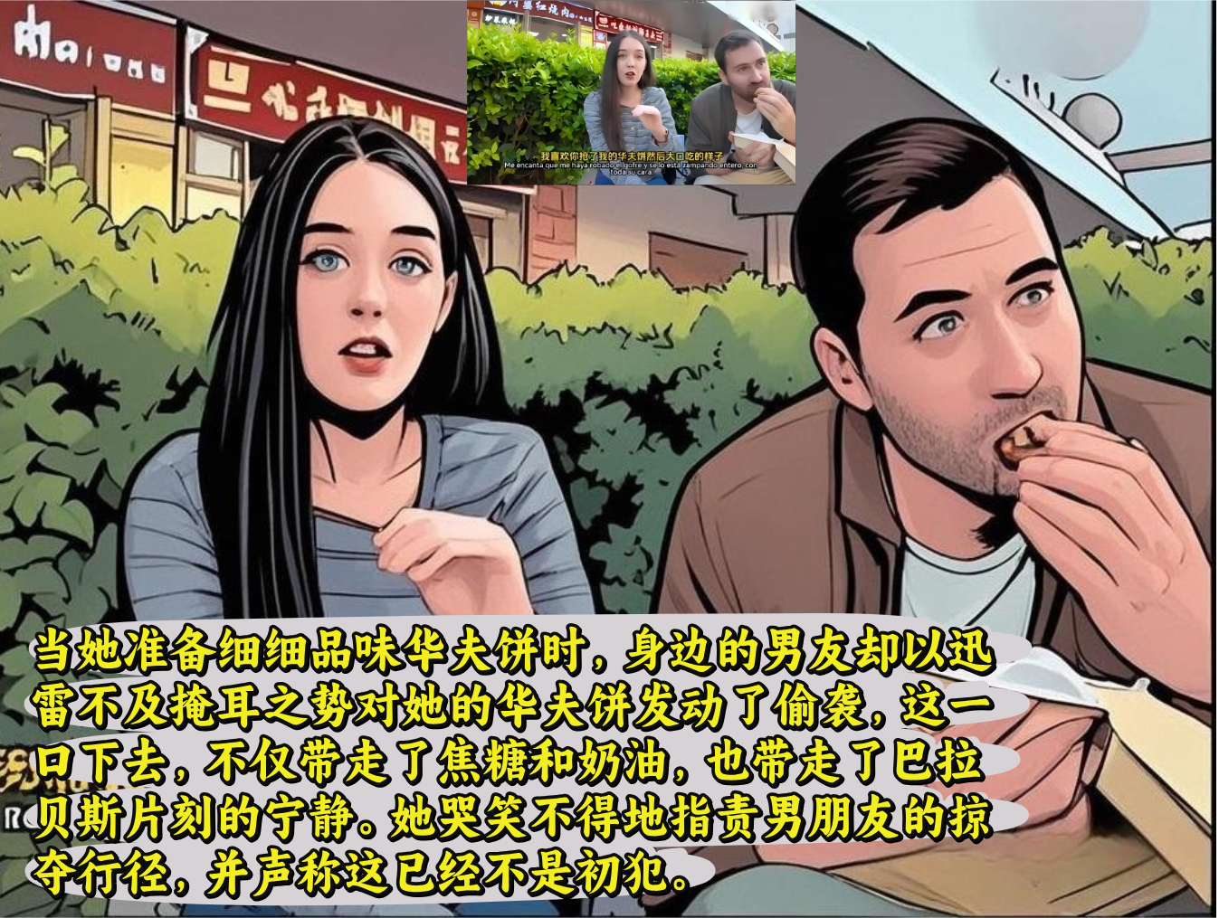 当她找到一个角落,准备细细品味华夫饼的美味时,真正的考验来临了,身边的男友以迅雷不及掩耳之势对她的华夫饼发动了偷袭,这一口下去,不仅带走了焦糖和奶油的甜蜜,也带走了巴拉贝斯片刻的宁静。