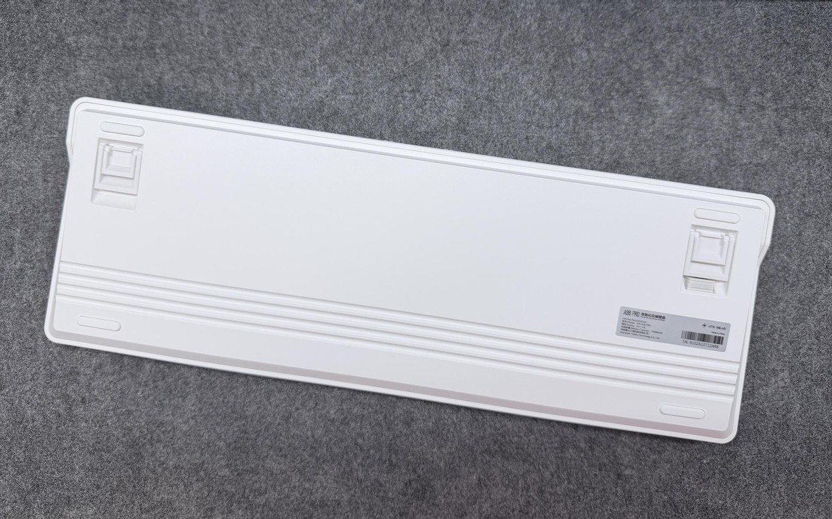 底面整体白色,有三条装饰纹显得比较灵动。四道椭圆跑道型的硅胶条可以提高键盘的抓地力。