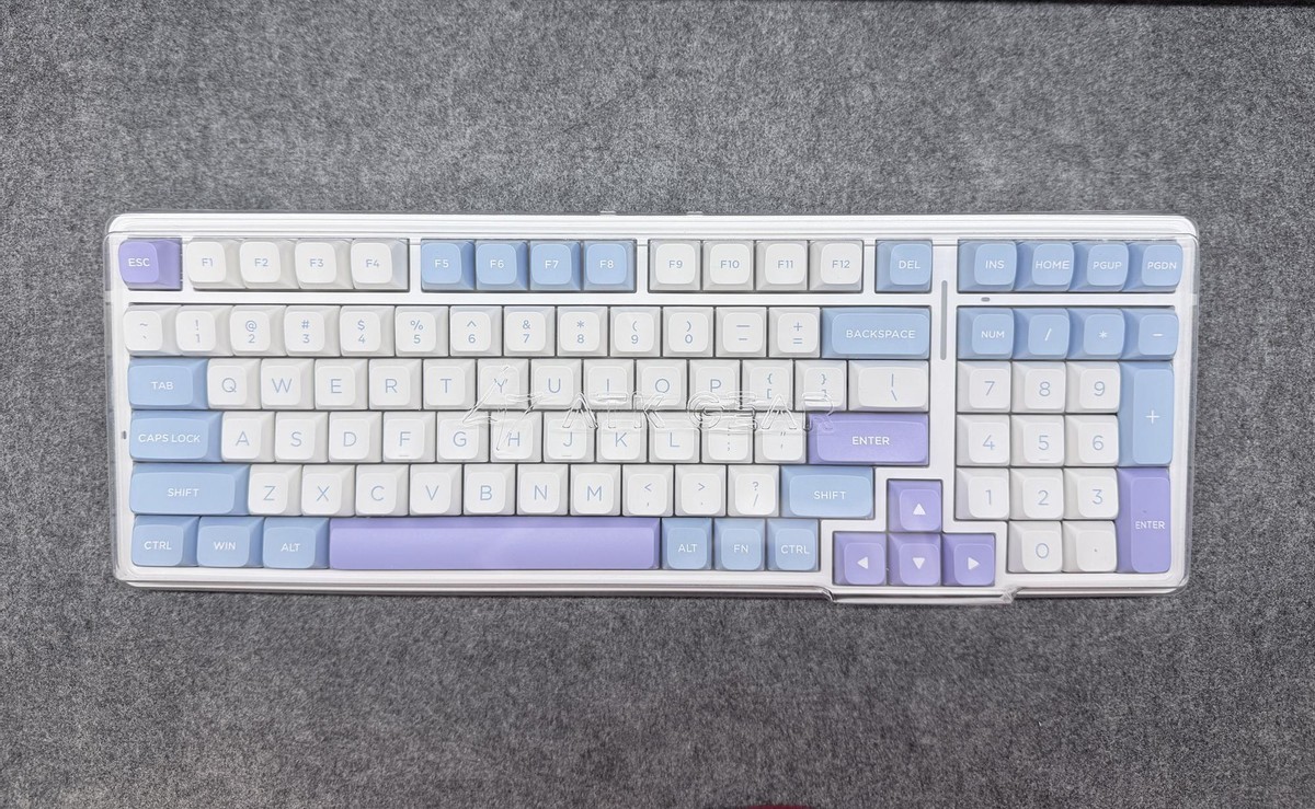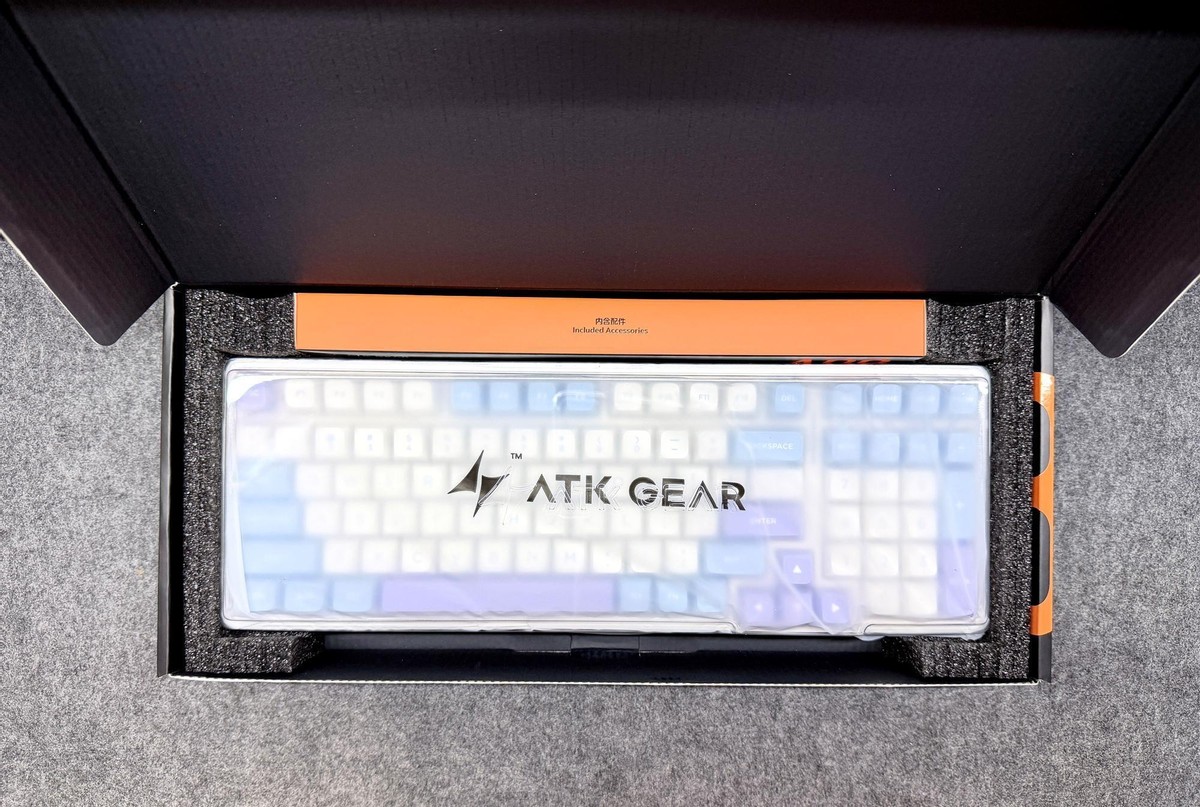 配件盒的配色和主包装相呼应,包装里还有一个透明的键盘防尘罩,罩面上也有ATK的logo,细微处显示出ATK的一丝不苟。