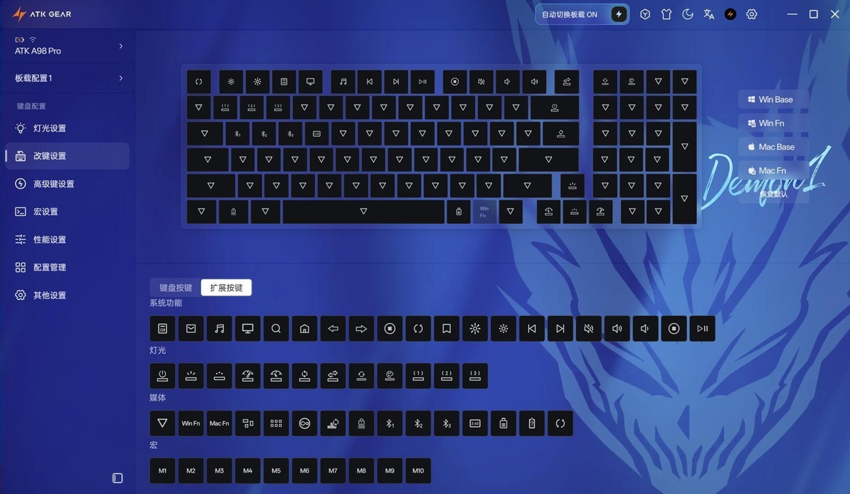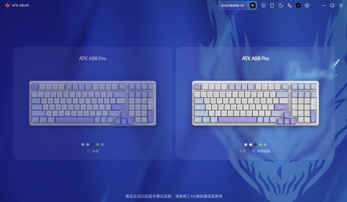 除了超强的配置,ATK A98 Pro的配套软件也是非常强悍。建议大家搭配软件使用可以完美释放A98 Pro的全部实力。驱动自动认出键盘通过无线和有线和系统连接,可见ATK在软件方面还是下了一番功夫。