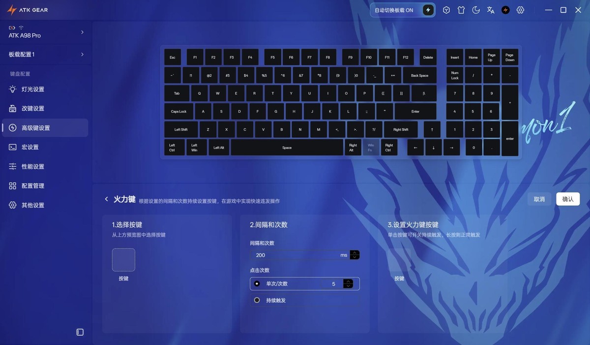 高级设置 里可以在游戏中设置火力健,设好间隔和次数后再游戏里直接使用,单击该按键就可以持续触发,快人一步。