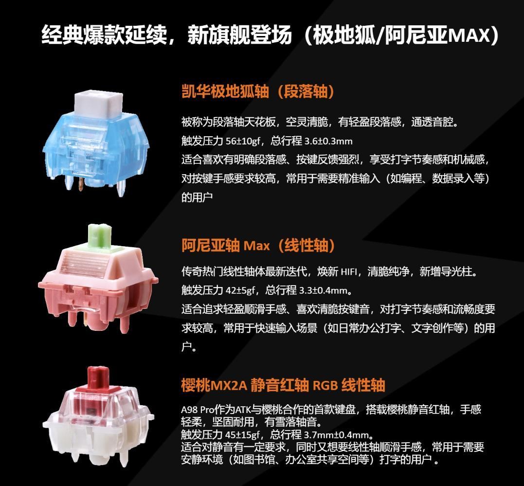 A98 PRO提供了发声轴天花板极地狐轴、热门的HiFi线性轴阿尼亚MAX、和樱桃公司合作推出的樱桃静音红轴等顶级轴体可供选择,适应不同用户的需求。之前使用的是HiFi声轴,这次选择了ATK和樱桃首次合作的樱桃静音红轴,既有机械轴的手感,又有薄膜键盘的静音,可谓一举两得。