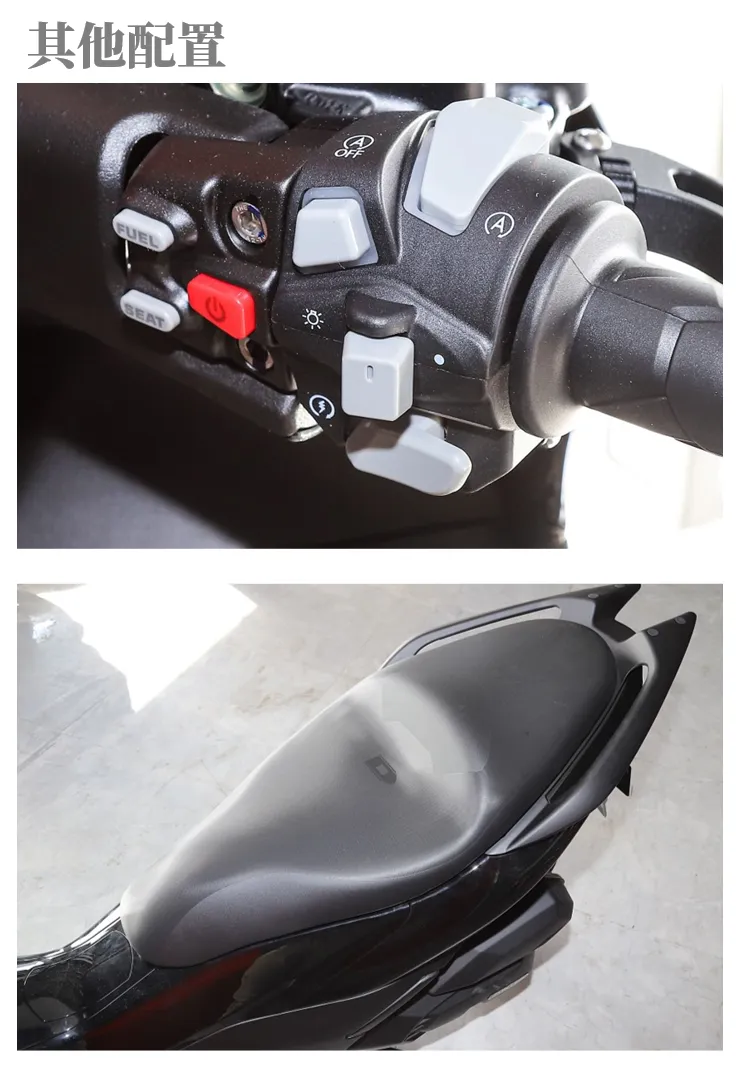 再看车头把手,平常150踏板基本上就是转向灯、大灯、点火开关、喇叭这些按钮,升仕这个按钮的丰富程度真堪比汽车界的标致5008。毕竟这只是一个150排量踏板车。