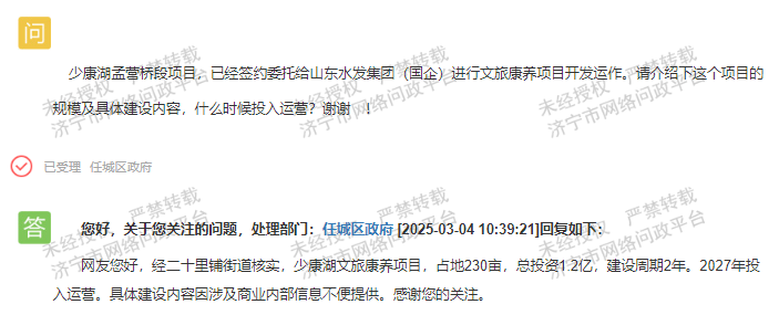 针对网友关注的问题,任城区政府回复表示,经二十里铺街道核实,少康湖文旅康养项目占地230亩,总投资1.2亿元,建设周期为2年,预计将于2027年投入运营。具体建设内容因涉及商业内部信息不便提供。