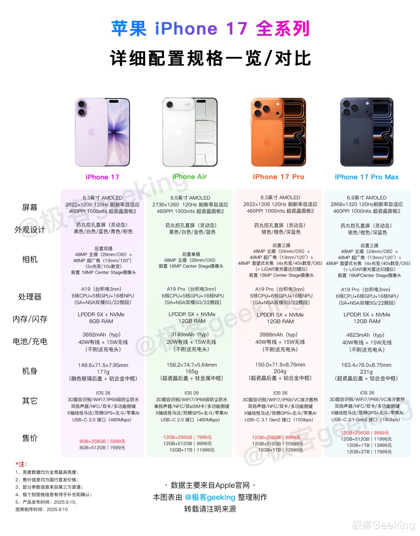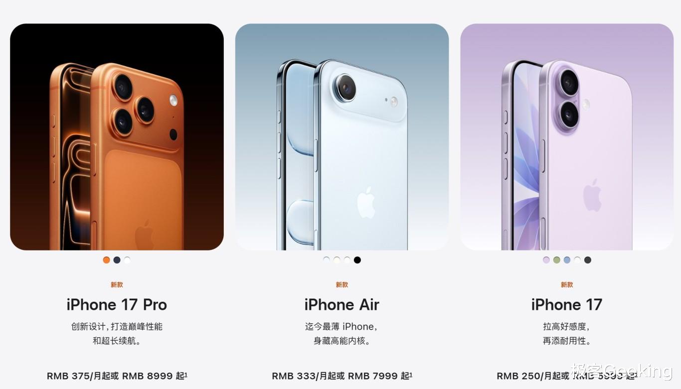 作为竞品的 iPhone 17 系列,现已在 9 月 10 日被正式发布,全系列 4 款机型的价格是 5999 元起(8+256GB),最高售价至 17999 元。极客君曾写有 iPhone 17 系列的解读文章,一文带你详细了解 iPhone 17 系列如何选和配置参数区别。