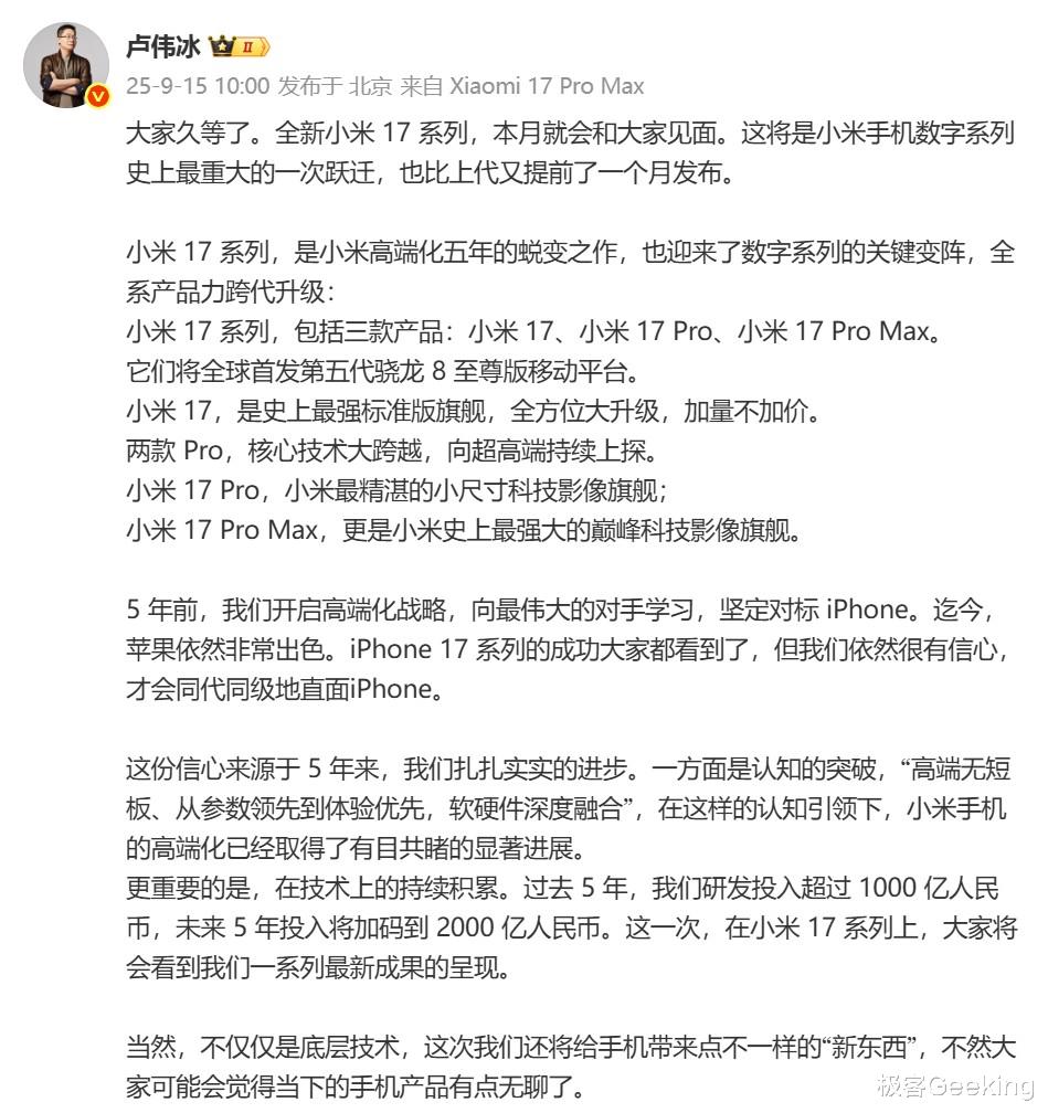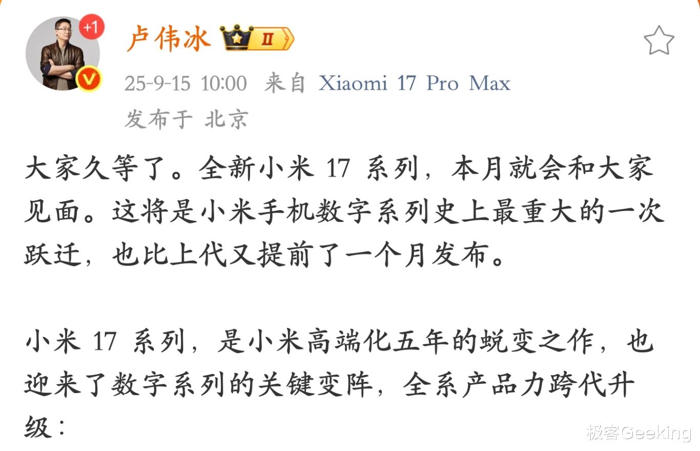 最初是小米总裁、小米品牌总经理卢伟冰率先在个人微博官宣,称全新小米17 即将在本月正式发布,并表示这是小米手机数字系列史上最重大的一次跃迁,也比上代又提前了一个月发布。
