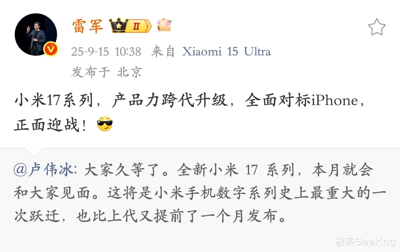 小米创始人和 CEO 雷军转发确认了这一官宣,并称“小米17系列,产品力跨代升级,全面对标 iPhone,正面迎战”。