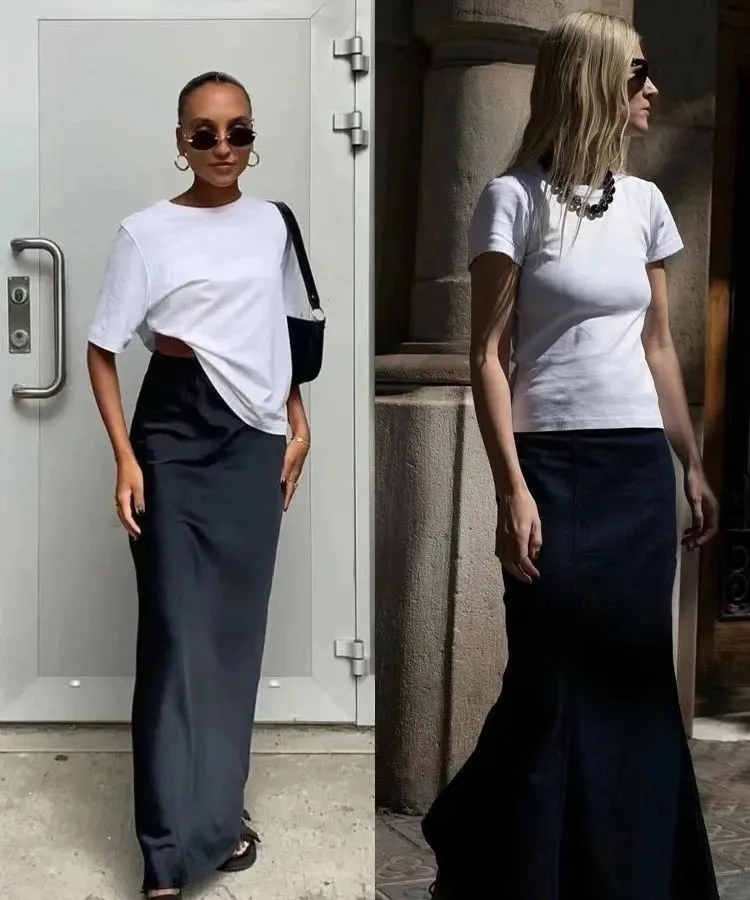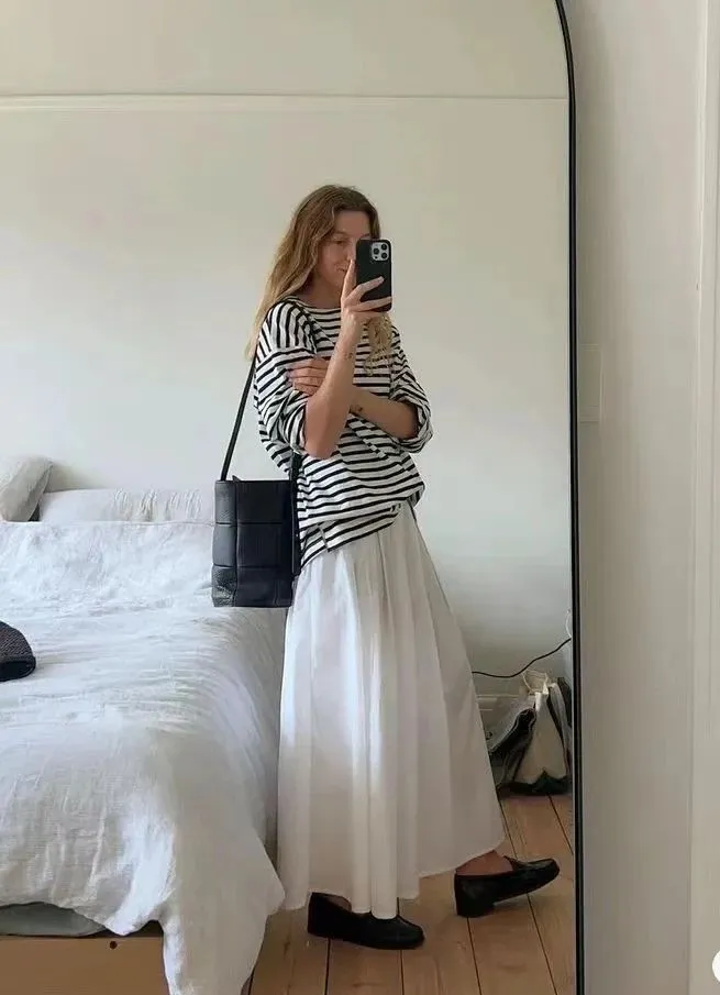 “T恤+半身裙”的组合,简约而不失格调,无需刻意的装扮,更能抚平内心,舒服自然、简约松弛