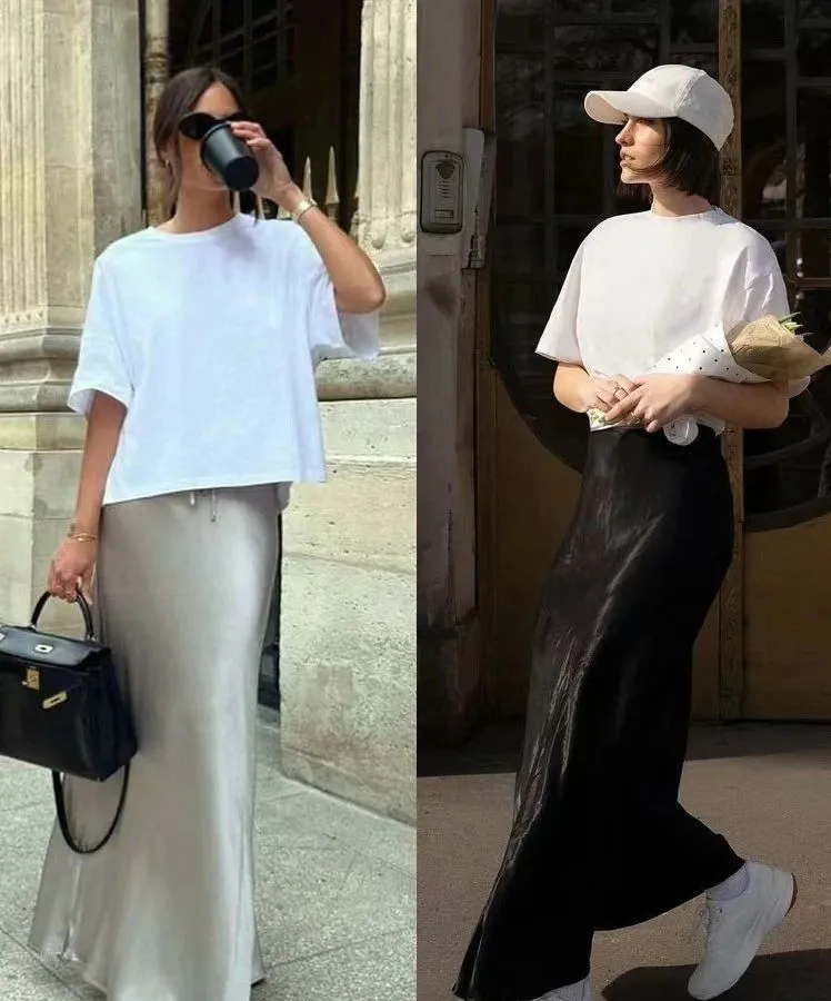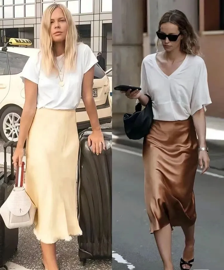 丝绸半身裙,以其独有的光泽感和滑顺触感,轻轻包裹着下半身,搭配上一件简约大方的T恤,这份优雅与随性在不经意间达到了完美的平衡。