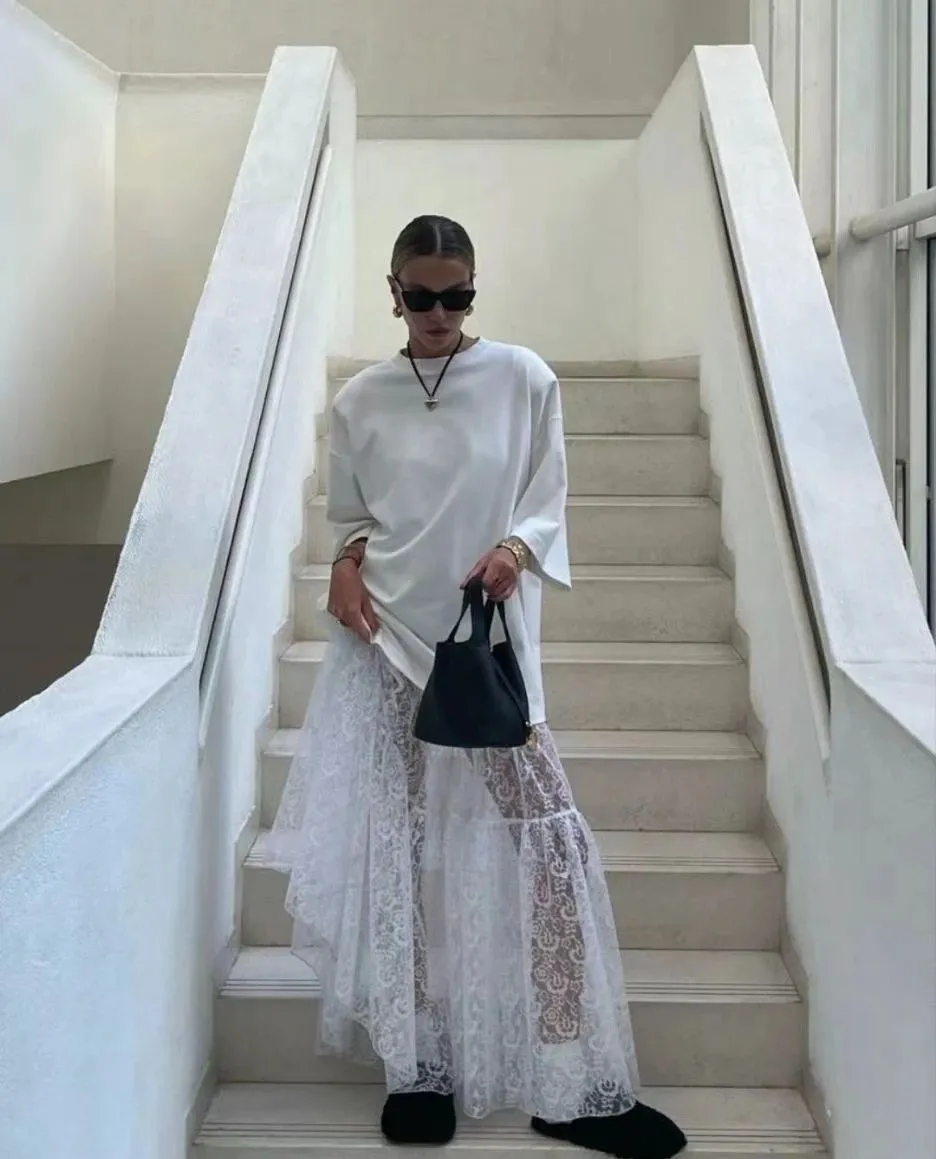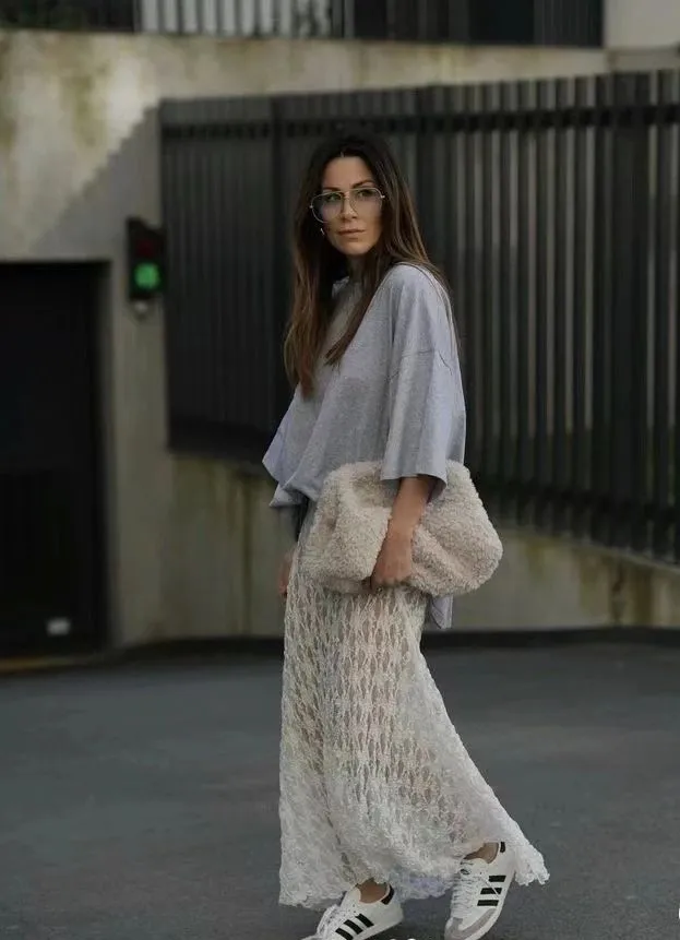 “T恤+蕾丝半裙”是非常新颖的搭配组合,两种完全不同风格的碰撞会让人有意想不到的风格,